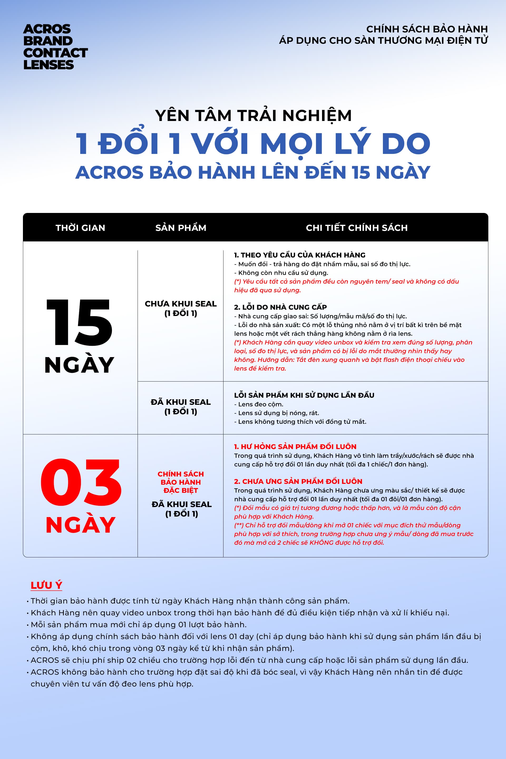 - ACROS CAM KẾT SẢN PHẨM KHUYẾN MÃI LUÔN ĐẠT CHẤT LƯỢNG CAO, nên ACROS chấp nhận bảo hành 01 đổi 01 (chỉ đổi mới đúng mẫu/đúng độ cận đã mua sắm trước đó) trong vòng 07 ngày tính từ ngày mua hàng trên hệ thống quản lý tại ACROS Brand Contact Lenses khi Quý Khách đeo lần đầu bị cộm - khô - khó chịu, hoặc kính áp tròng bị lỗi do nhà sản xuất (có 01 lỗ thủng tròn ở vị trí bất kỳ trên bề mặt).
